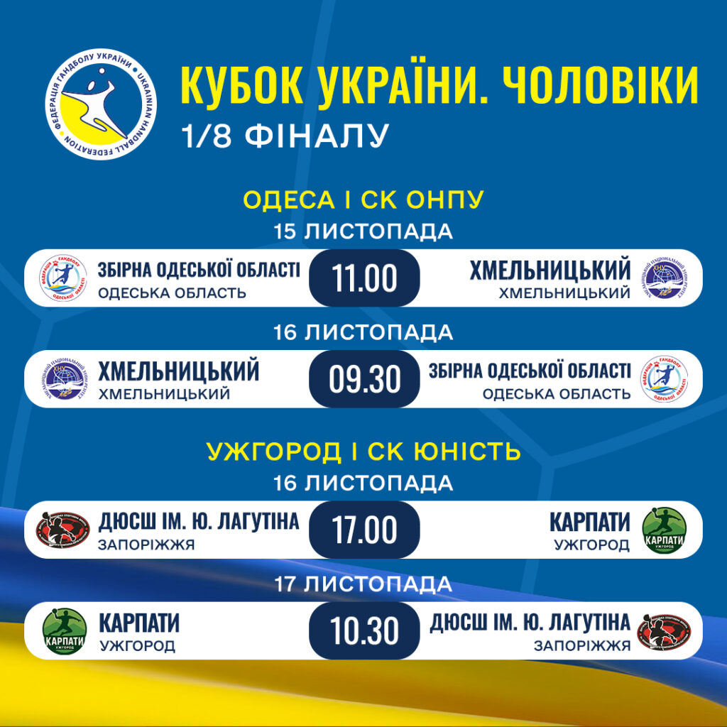 Матчами в Одесі та Ужгороді стартує Кубок України з гандболу серед чоловічих команд сезону 2025/2026. В 1/8 фіналу гратимуть «Збірна Одеської області» – «Хмельницький» та  «ДЮСШ ім. Ю. Лагутіна» – «Карпати». Переможці двоматчових протистоянь вийдуть до 1/4 фіналу. З цієї стадії приєднають решта учасників зокрема призери Кубка України минулого сезону «Мотор», «Одеса» та «Донбас».
